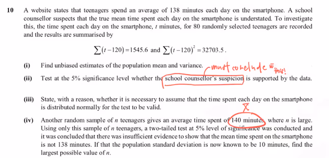 Part (i) for this Hypothesis Testing question is very straightforward, hence, let’s take a look at part (ii) instead. Part (ii) requires you to find out whether the ‘true mean time spent each day is understated’, as lifted from the question. Thus, you will need to perform a single-tailed test to find out if the ‘true mean time’ is more than the given mean of 138 minutes (Fig 4.). In the preamble, the question did not state that it will be following a normal distribution model, hence you will need to use the Central Limit Theorem (CLT).