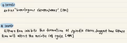 You’re taking on Biology at an “advanced level”, meaning that examiners will have higher and significantly more stringent requirements. Questions are not as straightforward and will longer only require regurgitation (Fig 2.). In Fig 2, both questions involve the idea of homologous chromosomes, however, as you can see, the O Level question is much more direct; it is a simple “definition” question. On the other hand, the A Level question is much more in-depth and calls on your analytical skills. It requires you to relate how the formation of spindle fibers during prophase I is inhibited due to the action of GTPase Ran, preventing bivalents from forming.