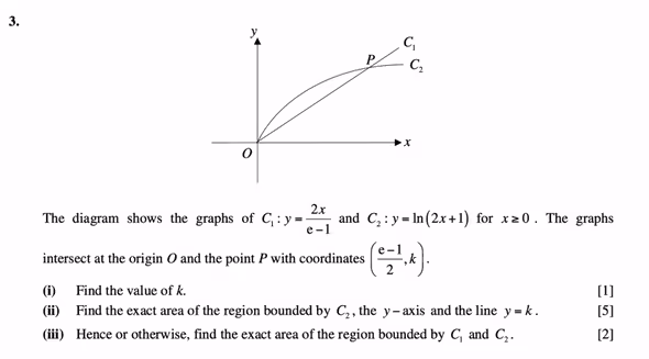 To tackle parts (i) and (ii), students have to first find the point of intersection between the two graphs, at the point P. The x-coordinate of P has been provided in the question and students only need to figure out what k represents, which will give them 1 mark as indicated by part (i). To do this, you simply have to sub the equation of either C1 or C2 with
