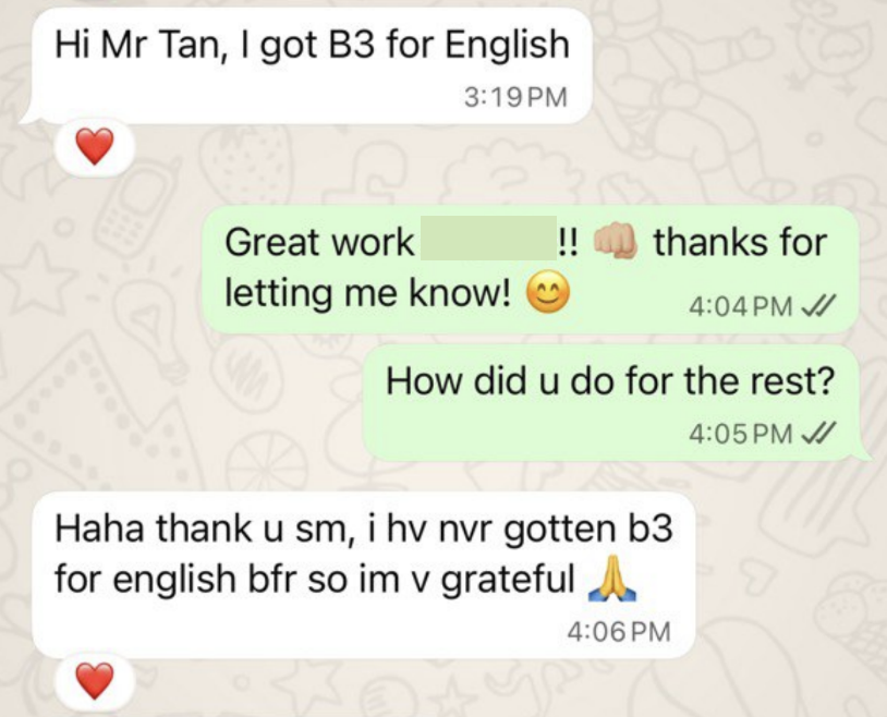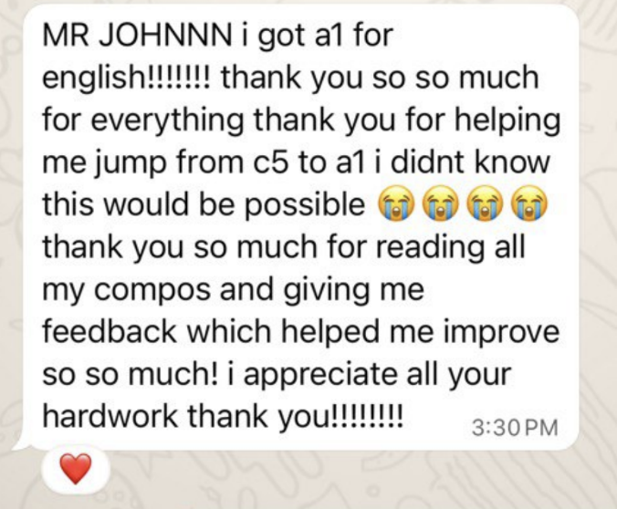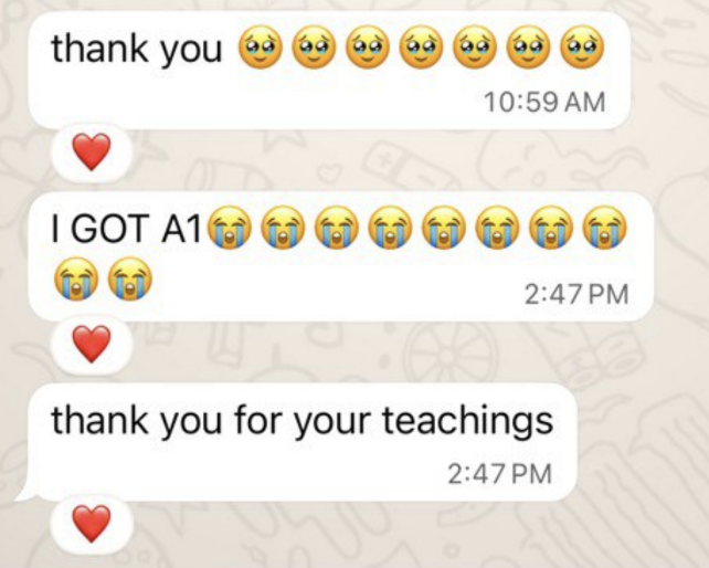 A passionate and caring teacher who will go the extra mile to support them in their studies. My students always look forward to my classes as they know that they will leave each lesson with something valuable or meaningful!