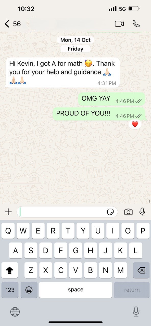 Kevin has been an incredible tutor who has truly made a difference in my understanding of Math. From the very first session, it was clear that he is not only highly knowledgeable but also genuinely passionate about teaching. His enthusiasm for the subject is contagious, and his love for teaching shines through in every lesson. He has a unique ability to break down complex concepts into simple, easy-to-understand steps, making Math far less intimidating. What sets Kevin apart is his friendly and patient approach. He never makes me feel rushed or pressured, always taking the time to explain things in a way that suits my learning style. Whenever I struggled with a topic, he found different ways to help me grasp it until I felt confident. He consistently goes the extra mile for his students, and I’m extremely grateful for his prompt replies—no matter how late I text him with questions. His encouragement and positive attitude have transformed my learning experience, turning a once frustrating subject into something I now enjoy. Thanks to Kevin’s support, I’ve seen a significant improvement in both my Math skills and confidence. I no longer feel anxious about solving problems, and my grades improved accordingly—culminating in an A for A Levels! More importantly, I’ve gained a deeper appreciation for the subject. All in all, Kevin is more than just a tutor. He’s a mentor and a friend who genuinely cares about his students’ success and well-being. His warm and approachable nature creates a comfortable and engaging learning environment where I never hesitate to ask questions or share my struggles. He celebrates my progress, encourages me when I feel stuck, and always reminds me that mistakes are part of the learning process. His support goes beyond academics—he listens, offers advice, and constantly motivates me to believe in myself. I’m truly grateful to have had not only a great tutor but also a mentor and friend.