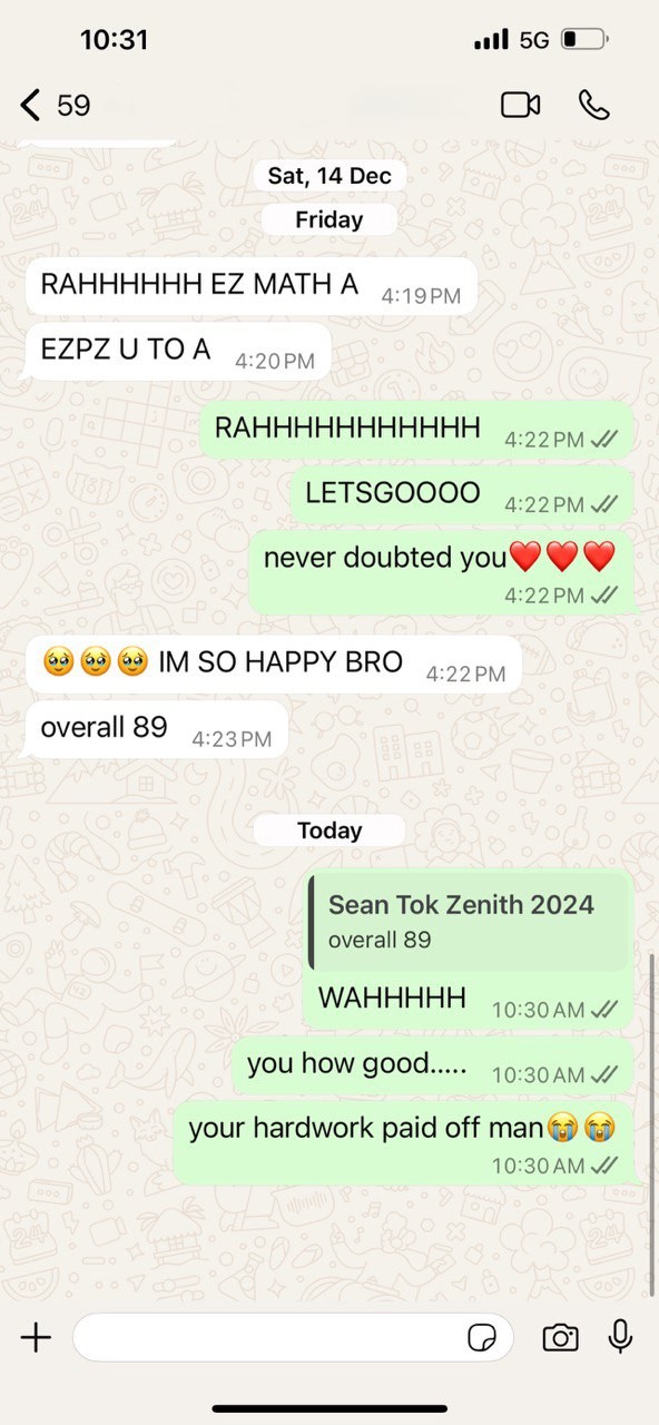 joined Zenith because I couldn’t keep up with my school’s progress and was falling behind. I struggled with the concepts and constantly scored poorly on my tests. Classes with Shi Neng helped me grasp the basic concepts, which gradually allowed me to understand more complex ideas. Shi Neng created a very comfortable environment in class, making it easy to ask questions when in doubt. He taught and shared jokes, which made lessons more engaging. Shi Neng never gave up on me and believed in me, even when I lost faith in myself due to my lack of improvement in grades. He constantly encouraged me and provided endless consultations, even via Zoom past midnight. He never once complained, even when he had to explain the same concept repeatedly. Shi Neng pushed me to achieve my final A-level grade while also taking care of my well-being. I would definitely recommend Zenith to my friends! ONG SHI NENG!!