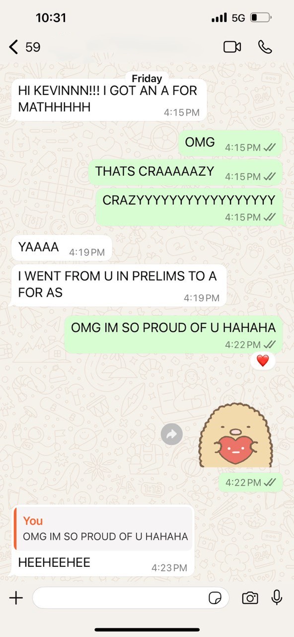 I remember first meeting Kevin at the start of the year in J2 and feeling a little overwhelmed by the class culture, as the first class I attended consisted of people who already knew one another. However, my concerns about not knowing anyone slowly disappeared as Kevin warmly welcomed me into his class. Kevin is also very detailed in his explanations. I always left class with a clear understanding of the concepts he taught, which helped me improve from a U in Math during Promos to an A in the A Levels. He was always ready to lend us a hand outside of class, even with matters not directly related to Math. He truly goes out of his way to ensure we are coping well, often encouraging us with small gestures—treating us to welfare items, turning the aircon down when the class gets too cold, or simply starting a conversation. Not only did Kevin teach us Math, he also shared life lessons he had learned growing up, which helped me realize that life isn’t all about academics and that there are many things beyond that. It taught me to appreciate what I have in the present and to find joy in the little things that keep me going. Overall, I felt Kevin's passion for teaching and his genuine kindness just by being in his class—both of which are rare traits today.