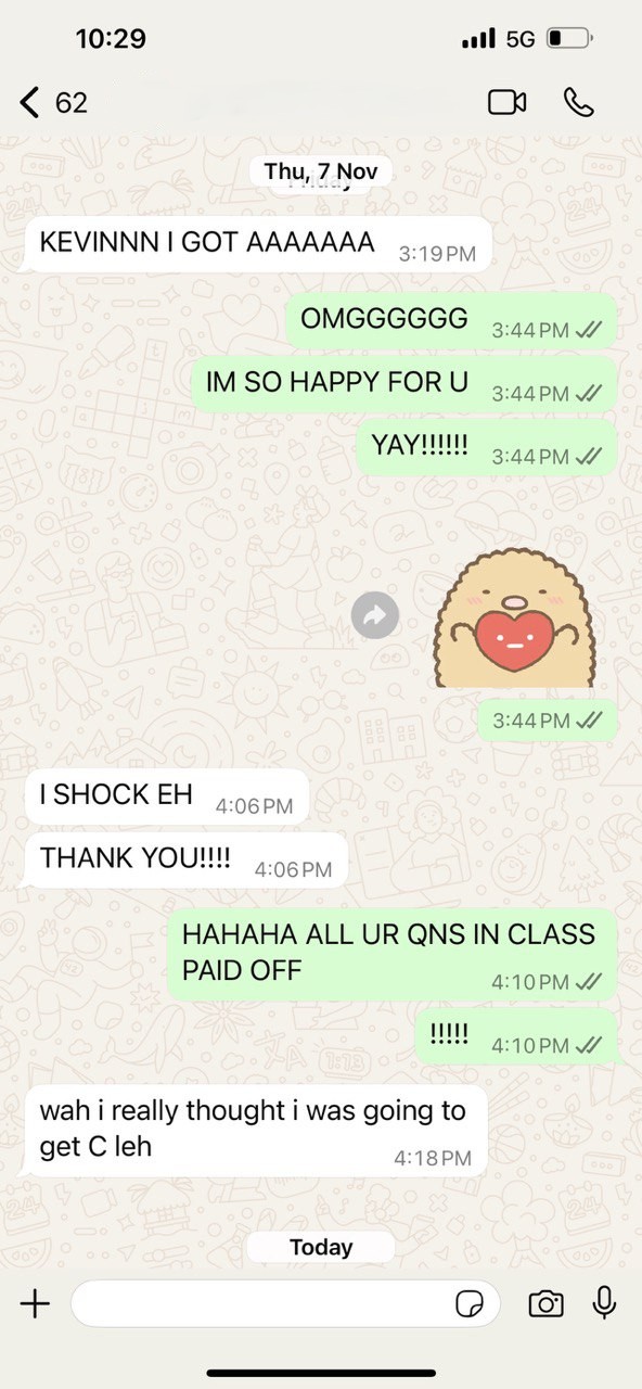When I first started my Economics journey, I really struggled to keep up with my school's lectures and tutorials. I couldn’t grasp the concepts and often felt completely lost. At one point, I even seriously considered giving up on the subject. However, Lay Chun was supportive throughout my entire journey, always reassuring me that there was still time to improve. He took the time to guide me through extra consultations and provided additional notes that helped highlight common mistakes. Lay Chun didn’t just give me answers—he walked me through the thought process behind each concept, which really helped me understand where my gaps were. Through this personalised guidance, I was able to identify my weaknesses and work on them. Even though I was failing during my prelims and feeling extremely worried, his support gave me the confidence to push through and succeed. Thanks to his dedication, my understanding of the subject became much clearer, and I saw a drastic improvement in my grades—for real!