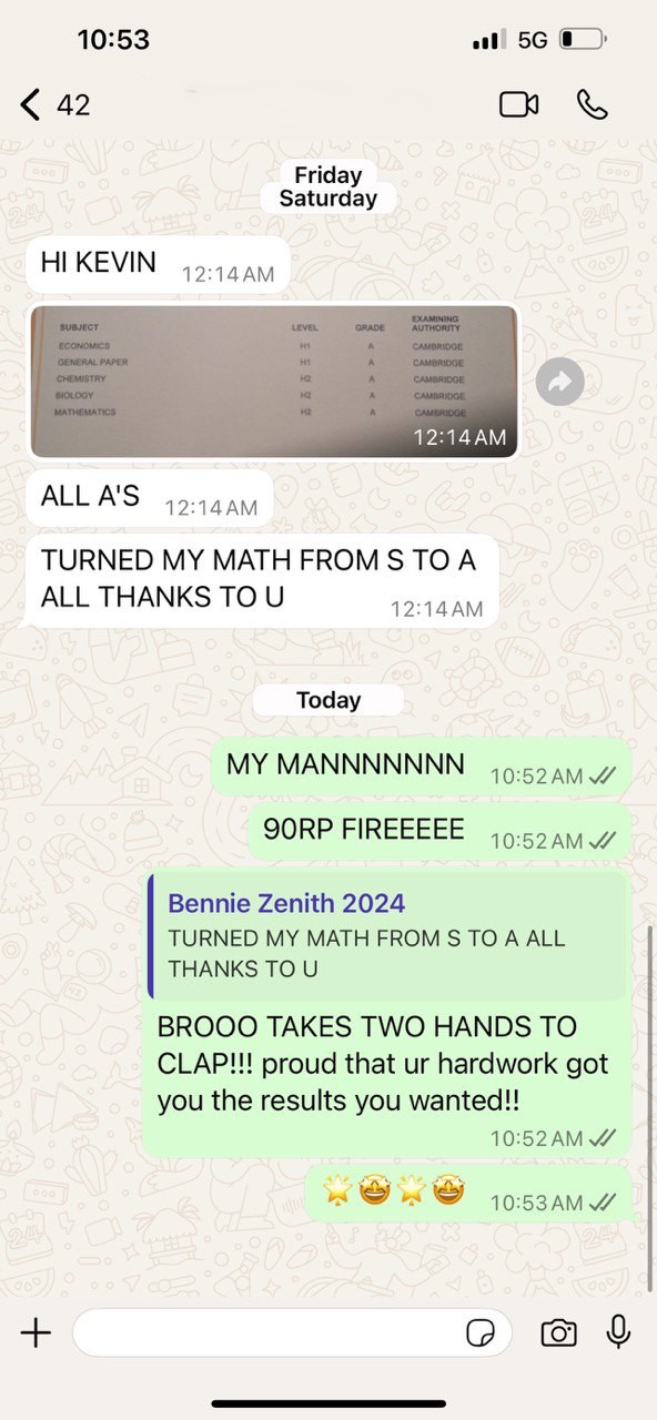 I first joined Kevin at Zenith after my J1 Mid-Year exams, in which I had performed quite poorly. In just a few months, Kevin helped me solidify my Math foundation, enabling me to achieve an A for the A Levels. I learned a lot under his guidance. He was friendly, approachable, and patient in explaining concepts, always making sure his students truly understood the material. He guided us through every chapter, ensuring we had a strong grasp of the basics before moving on to more challenging questions. Kevin genuinely cares for his students—he often took the time to talk with us and listen, regardless of the situation, and would even treat us to small welfare items. During prelims and the A Levels, he regularly offered words of encouragement and motivation, checking in on us to make sure we were coping well. He also provided plenty of resources to support our practice and preparation. Thanks to Kevin’s support, I was able to build a strong foundation in Math, improve significantly, and perform well in my exams.