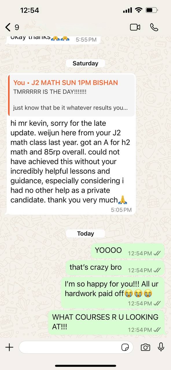 When I first joined Kevin for a trial class in J1, I was skeptical about how productive the lessons would be, but I’m glad I gave it a shot. Kevin’s lessons are fun and engaging. He shares success stories to motivate us, and his lessons are well-paced, clear, and meaningful. Every time I leave his class, I’ve learned something crucial that played a big role in my performance during Prelims and A-Levels. Kevin also shares a "quote of the week" as he counts down the weeks to A-Levels. On a personal level, I’m truly grateful for how he answered all my Math questions throughout J2, especially as I ramped up the number of papers I was doing. I really appreciate his constant support!